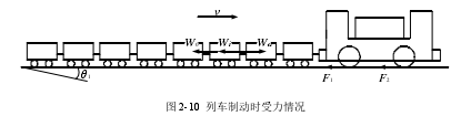 礦用電機車工作時牽引一組礦車在軌道上運行,其運動比較復雜,不僅是沿著軌道的縱向水平運動,還包括車體橫向的擺動、機車垂直方向上的跳動以及各個車體之間的相互撞擊引起的振動。然而,本文研究的是礦用電機車的制動特性,因此忽略制動時的其他運動,僅僅考慮沿著軌道水平運動,且礦車一般不帶制動裝置。在對礦用電機車整車制動狀態(tài)下進行動力分析時,將列車看成一個整體。列車制動時受力情況如圖 2-10 所示。